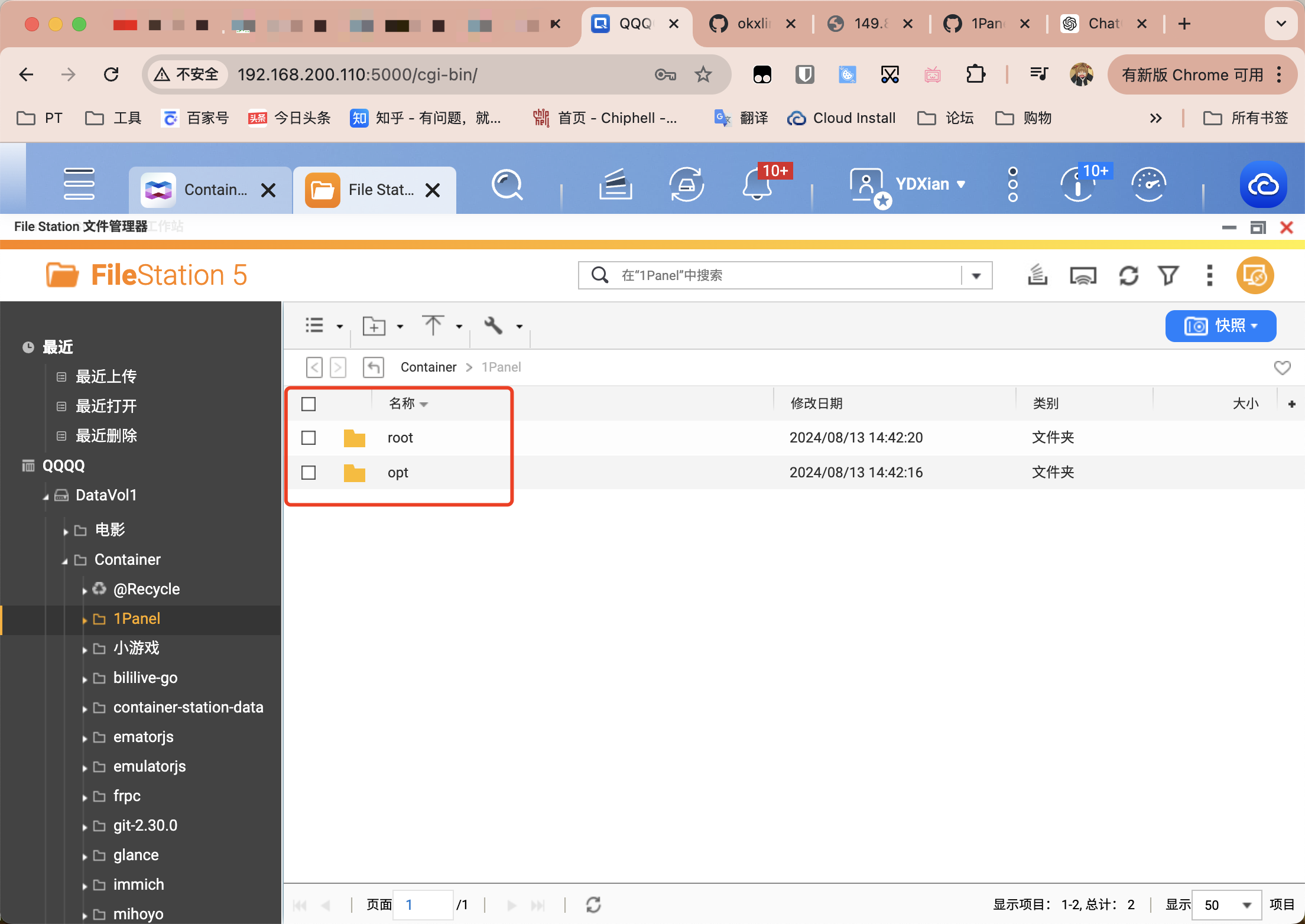在常用的Docker目录下,创建1Panel文件夹,在这之下再创建opt和root两个子目录。