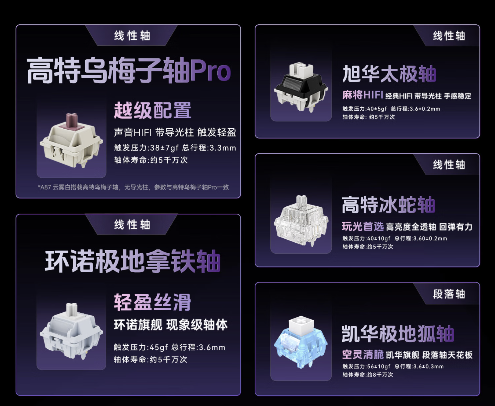 如果你有其他需求,比如想要更顺滑的极地拿铁轴、段落感更强的地狐轴、或者主打电竞回弹的太极轴,也可以根据自己的习惯选择,A87系列支持多种轴体互换,选择空间很大。