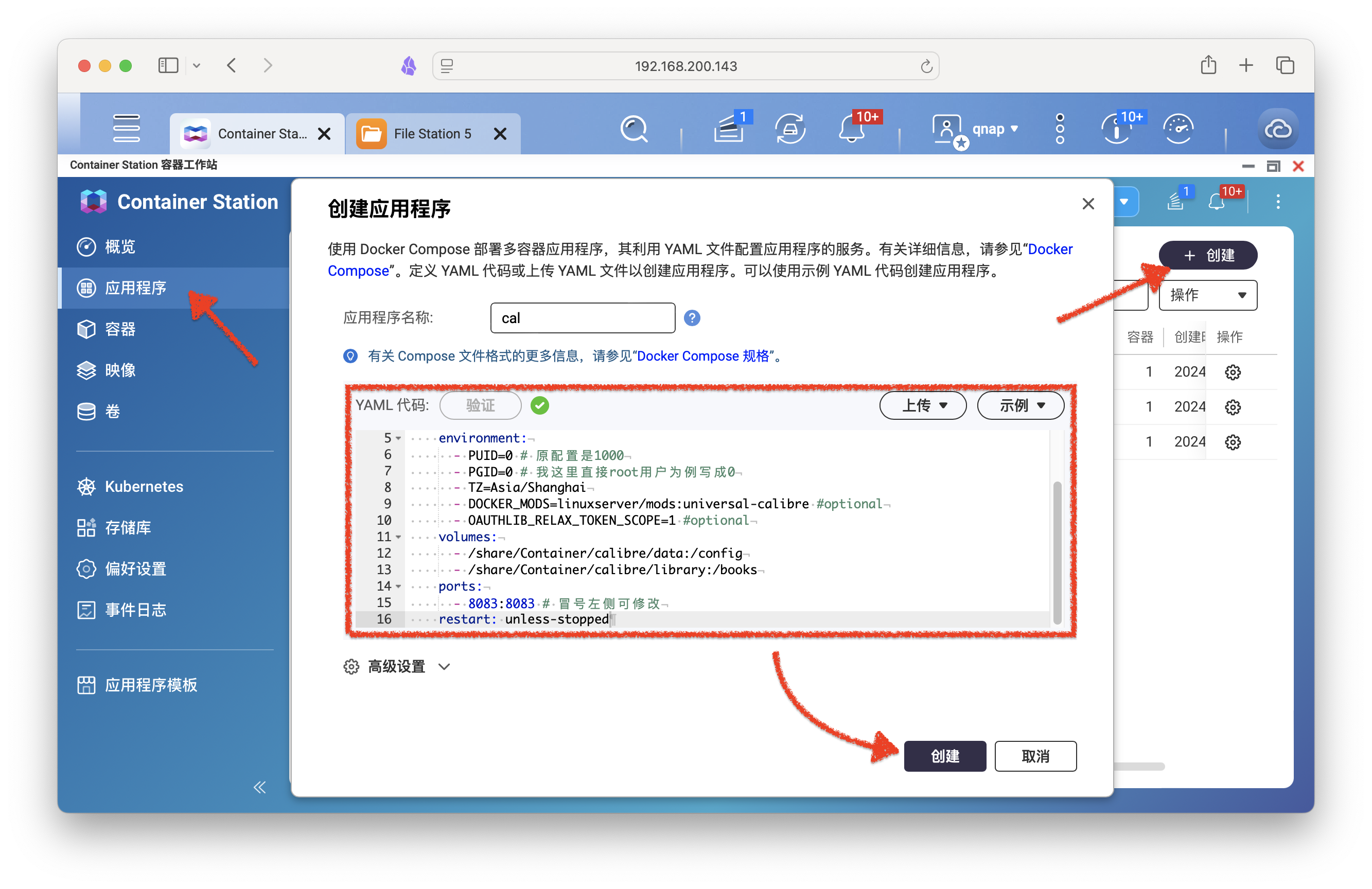 打开Docker管理工具,以威联通的Container Station为例。将以下代码修改后粘贴进框内,创建新的应用项目。