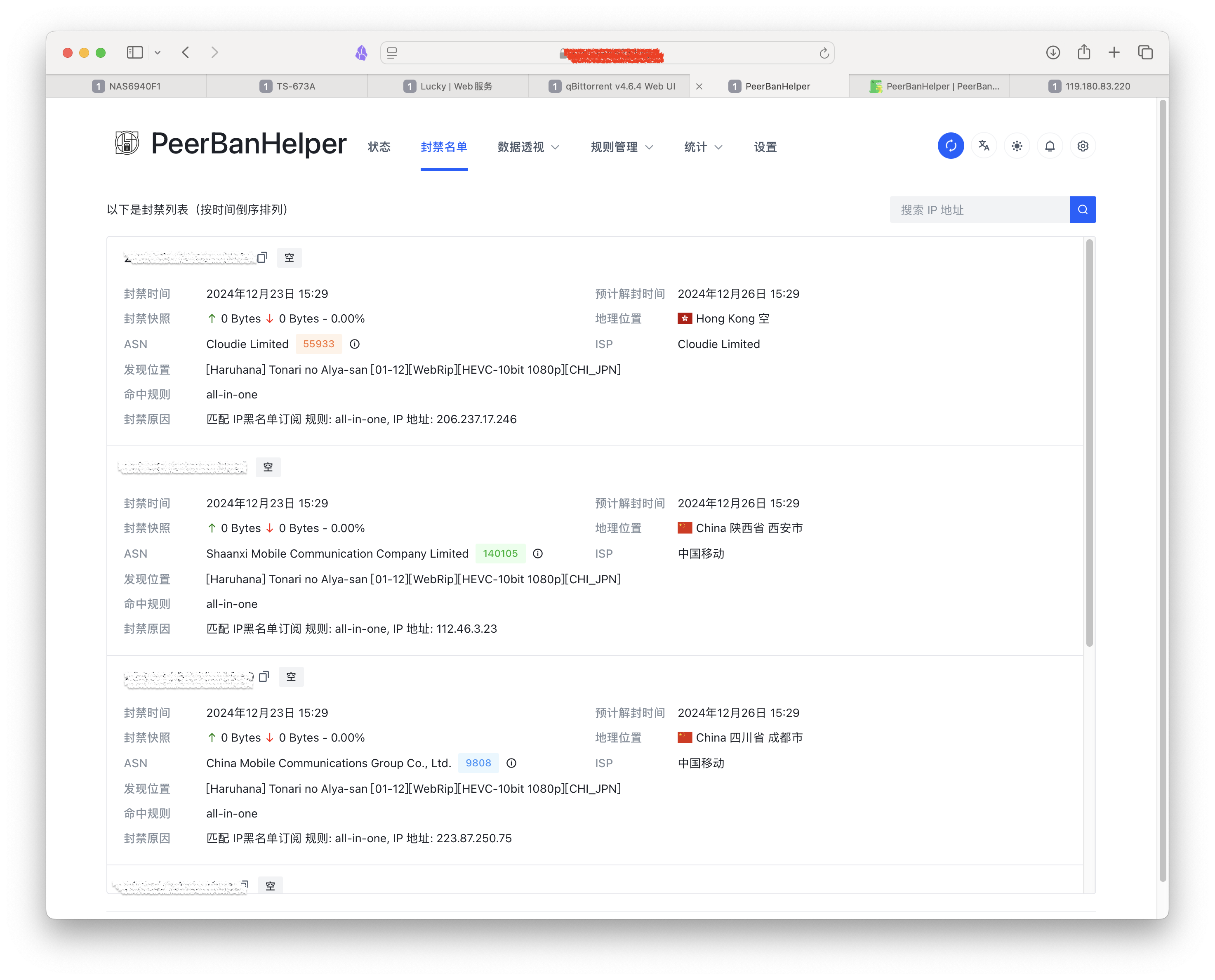 这里是我重新部署的一个qb,在添加一个BT的动漫种子之后,立即检测出了9个IP并封禁。可以想到,过去你以为自己在美滋滋贡献上传帮助别人,没想到全被吸血的给占了。