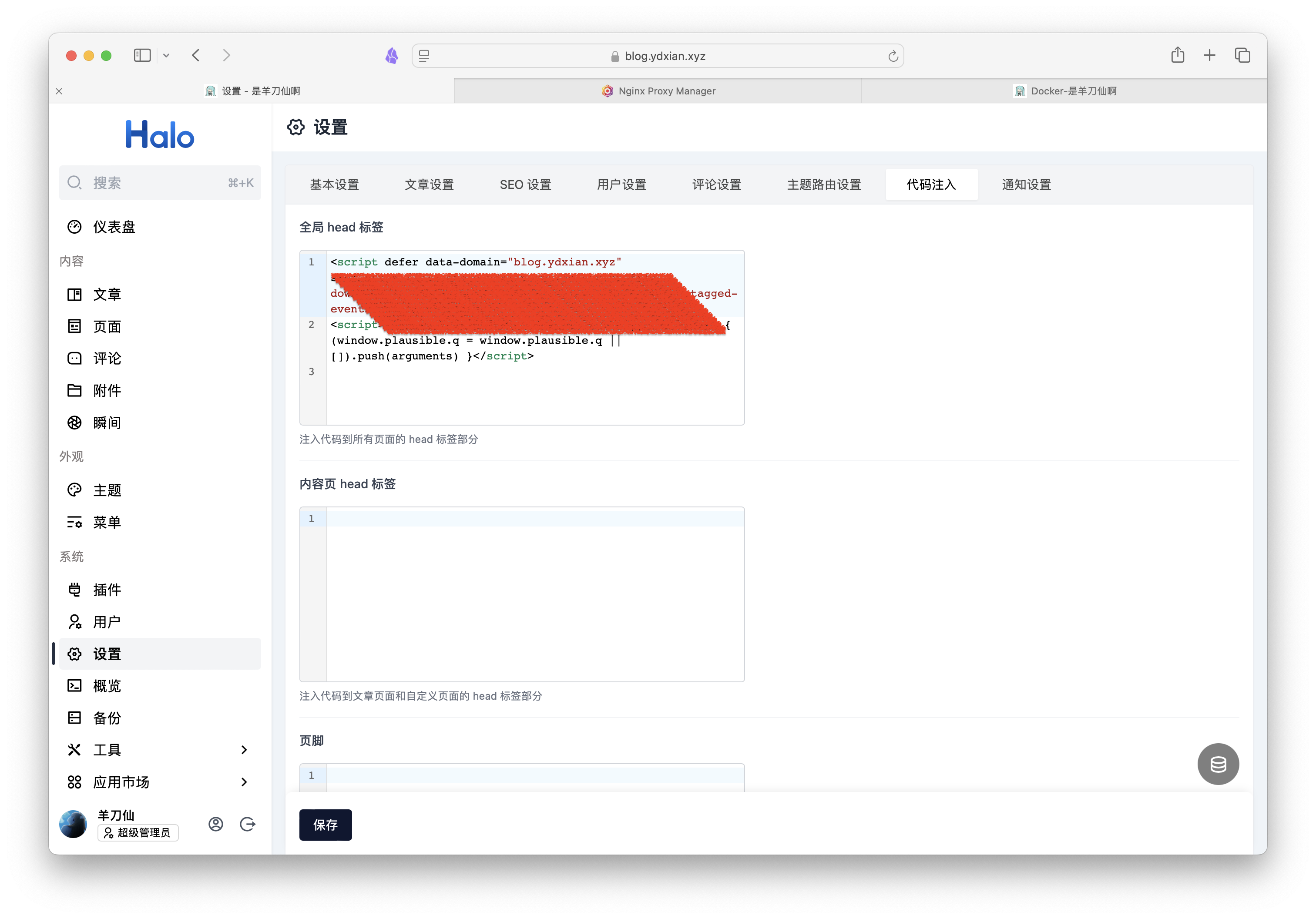 以Halo博客为例,进入控制台,点击【设置】-【代码注入】,将刚才的复制项粘贴进全局head标签中并保存即可。