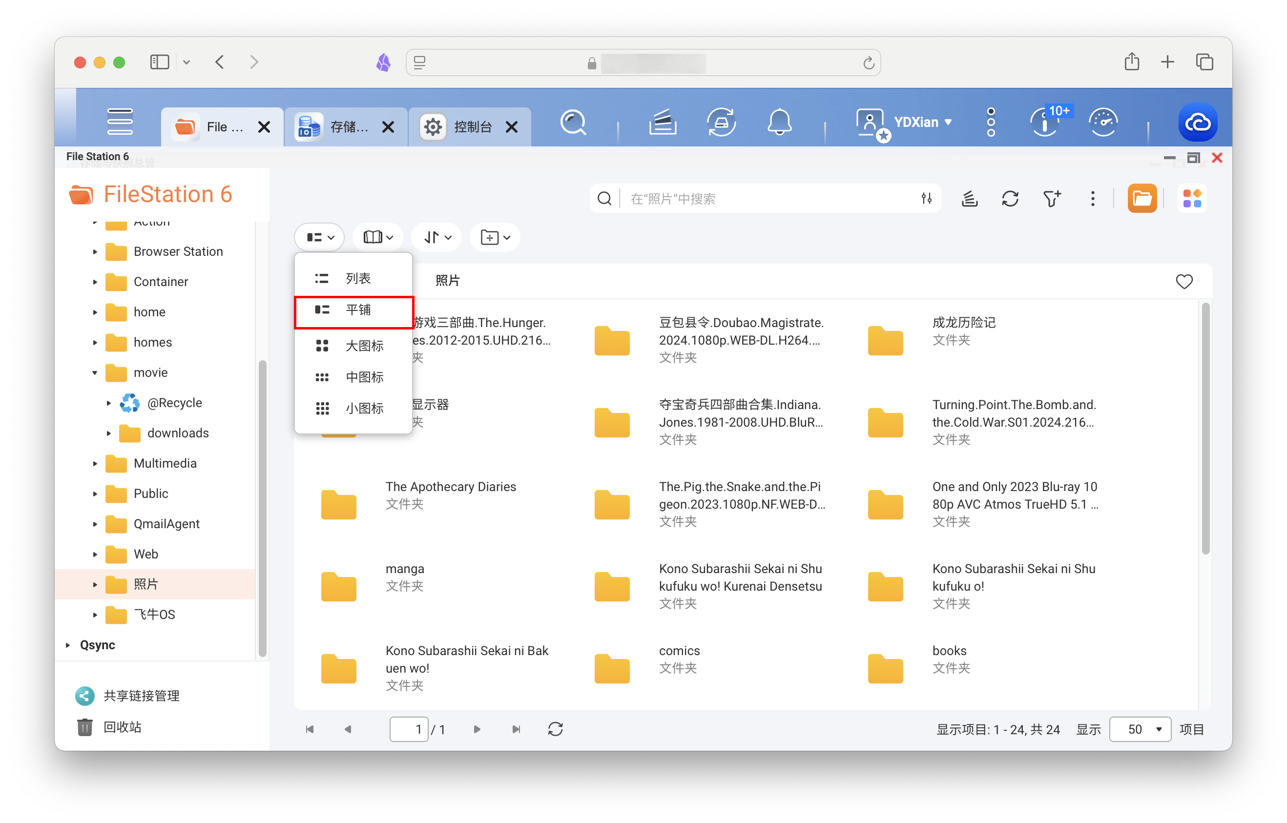 文件的显示区,相较于 File Station 5 多出了平铺展示。