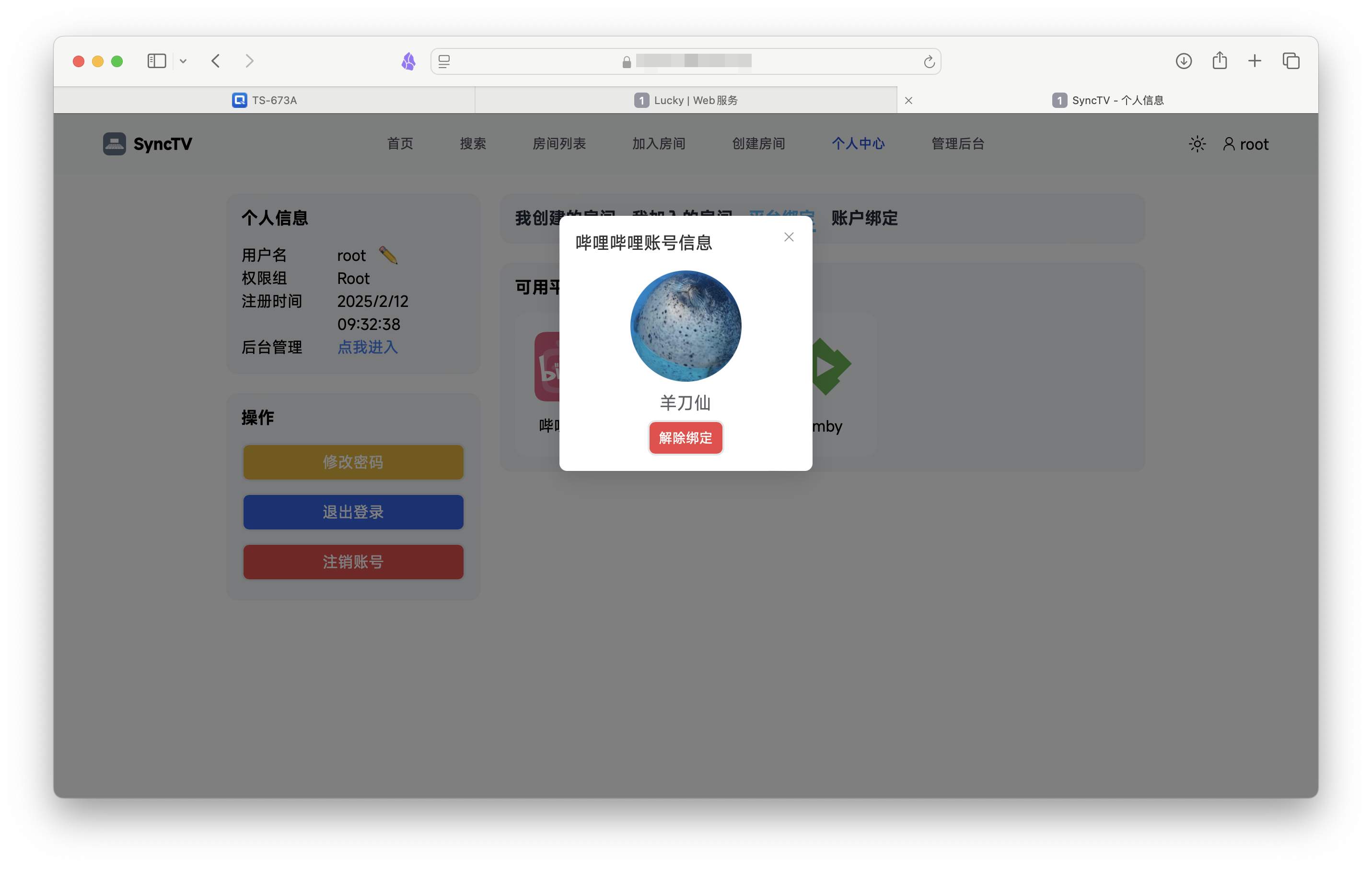 打开个人中心,目前支持绑定B站、Alist和Emby这三个平台,Jellyfin也已提上日程。