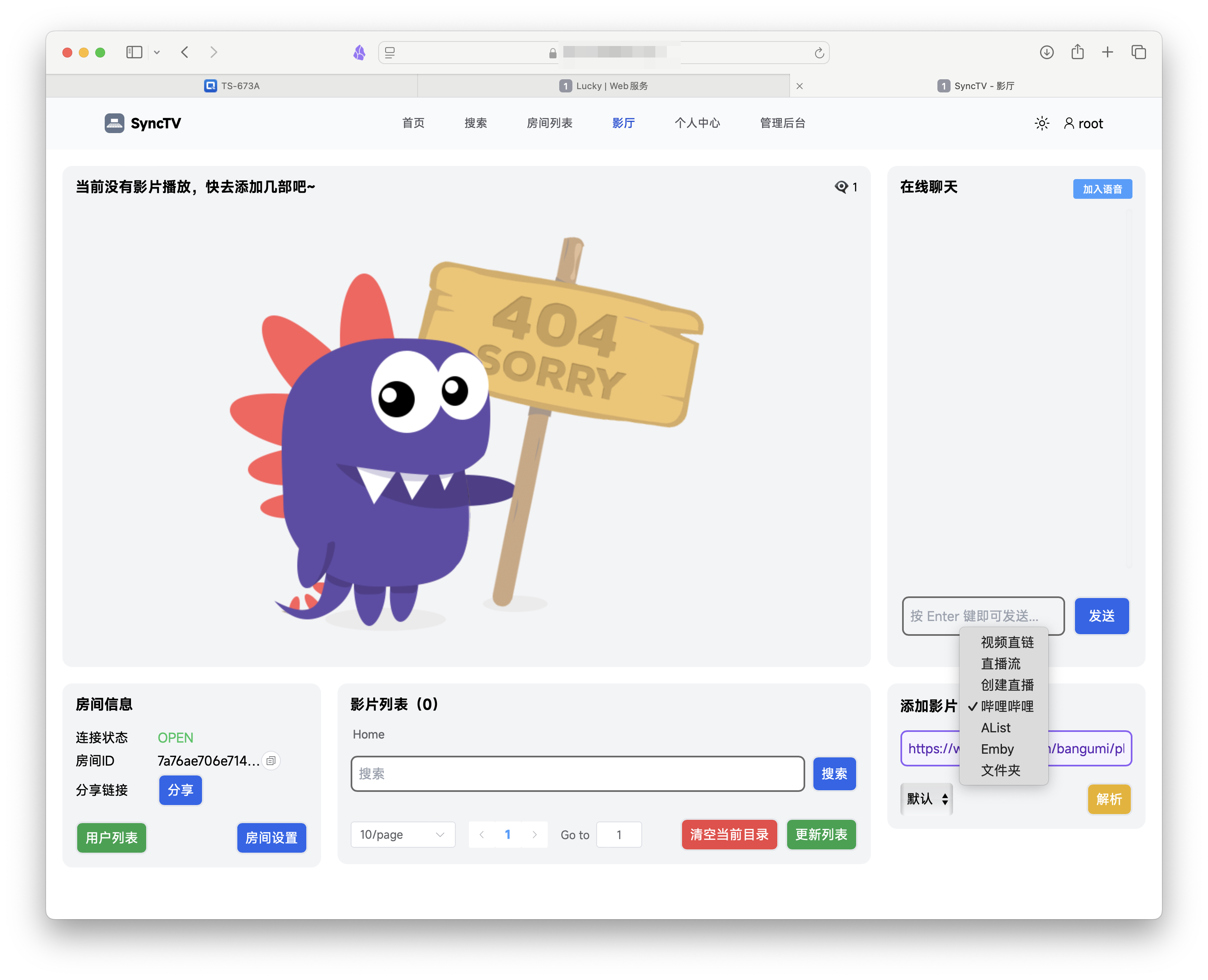 SyncTV 是一个允许您远程一起观看电影和直播的程序。它提供了同步观影、直播、聊天、同步观看、剧院和代理等功能。使用 SyncTV,咱们就可以与朋友和家人一起观看视频和直播,无论他们在哪里。