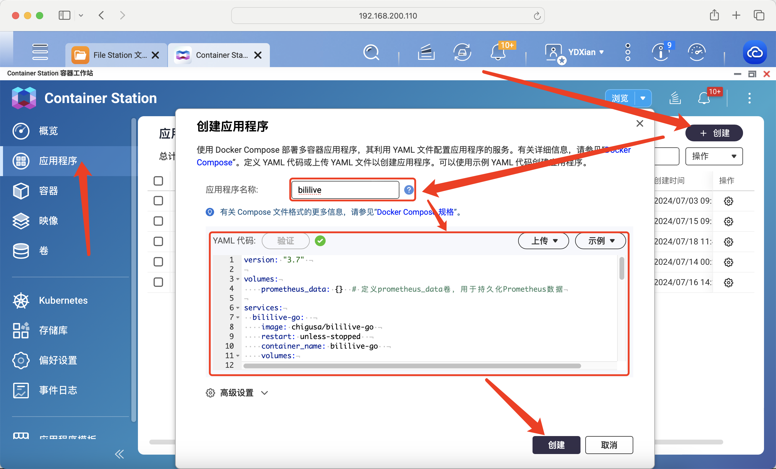 接着打开 Container Station,将上面的代码稍加修改(文件映射目录和端口号)后,复制粘贴进行创建: