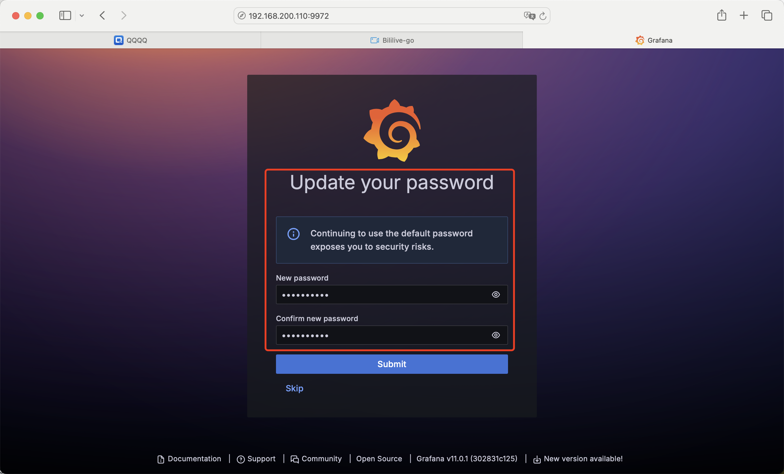上面grafana项目的管理员用户名及密码完全不用理会,默认皆为admin,就算不改,部署后第一次登陆也会强制咱们修改~