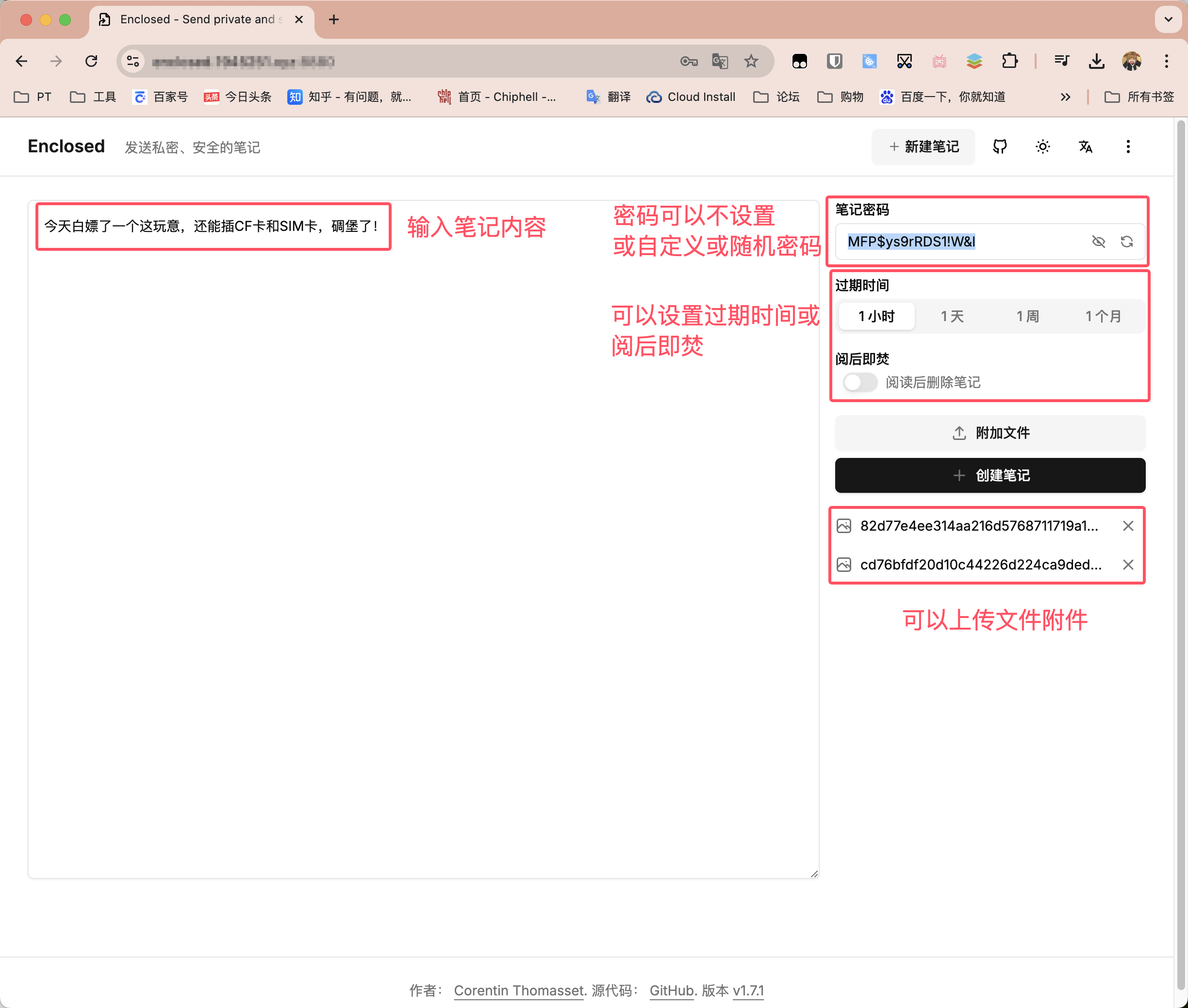左侧三分之二的大框可以输入文字内容,右侧可输入笔记密码,选择时效,开启阅后即焚一级添加附件文件。附件支持多文件上传,但并不能上传整个文件夹。