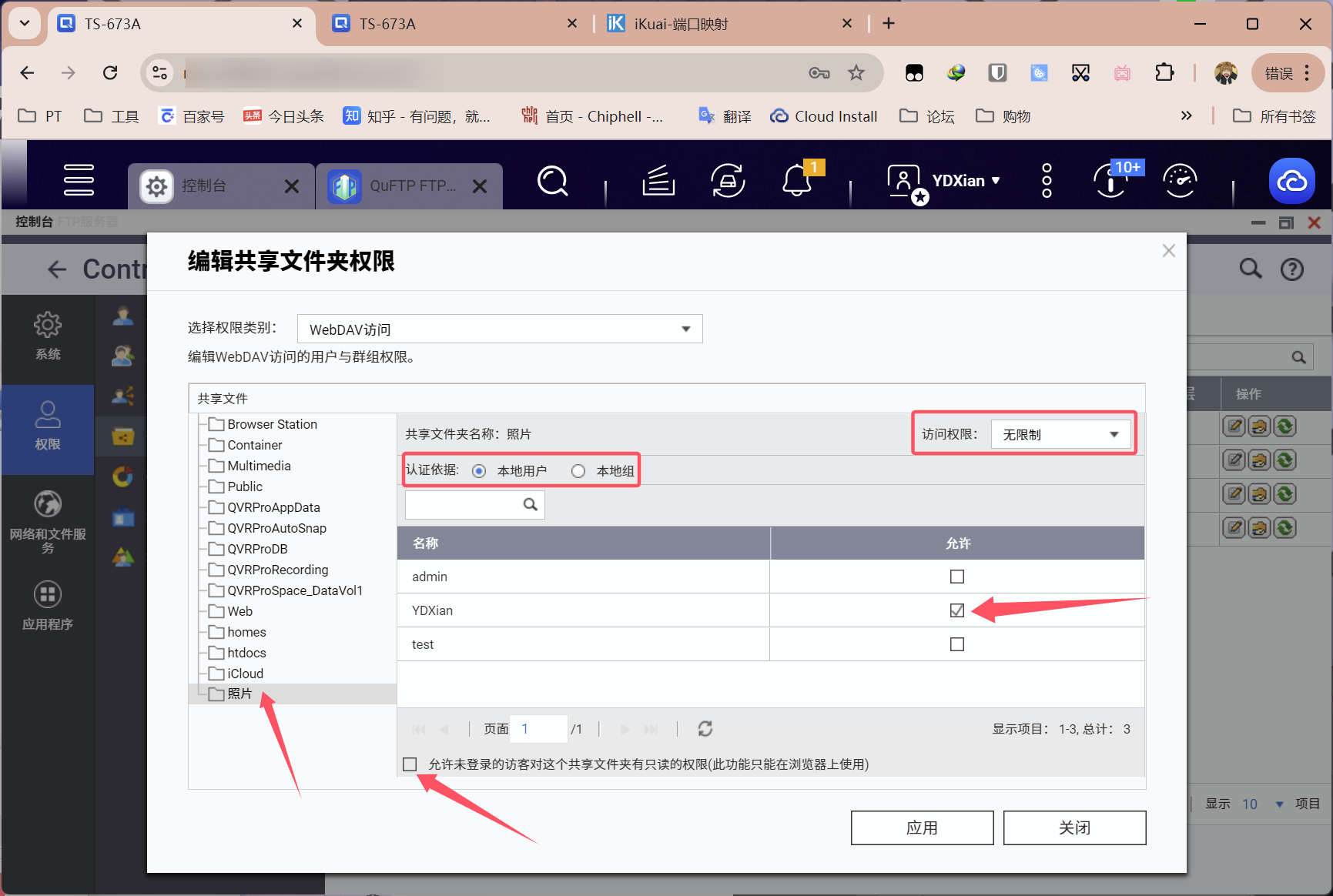 但如果你如上图所示,选择WebDAV权限,则需要像上面NFS服务那样,再单独开启共享文件夹以及账户的权限。设置好后再点击应用即可。