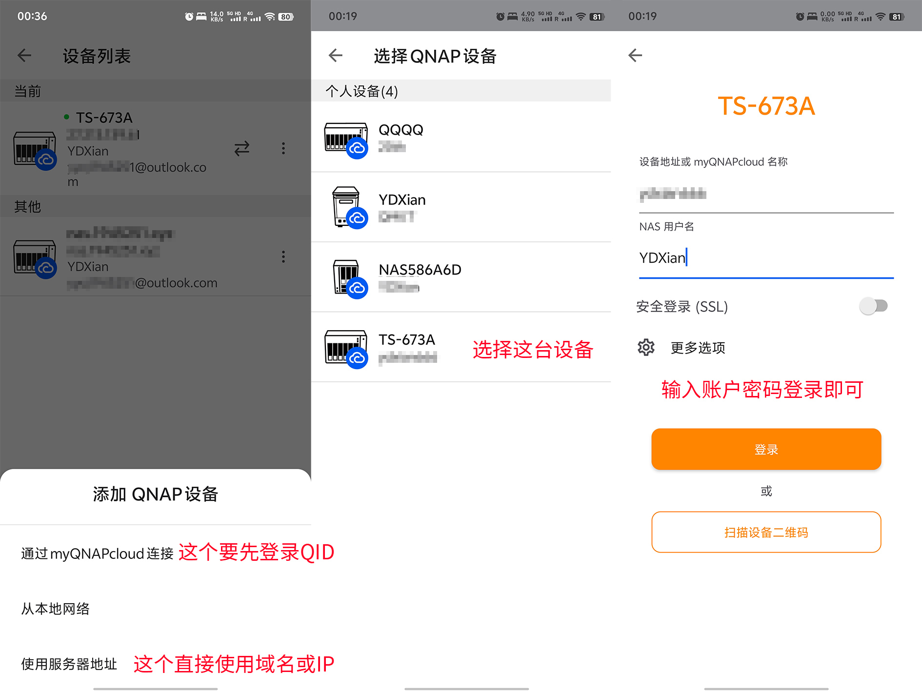 添加威联通设备,共有三种方式,第一种要登陆QID,选择地区的时候要注意,选错是登陆不上的。选择对应设备输入帐密即可。