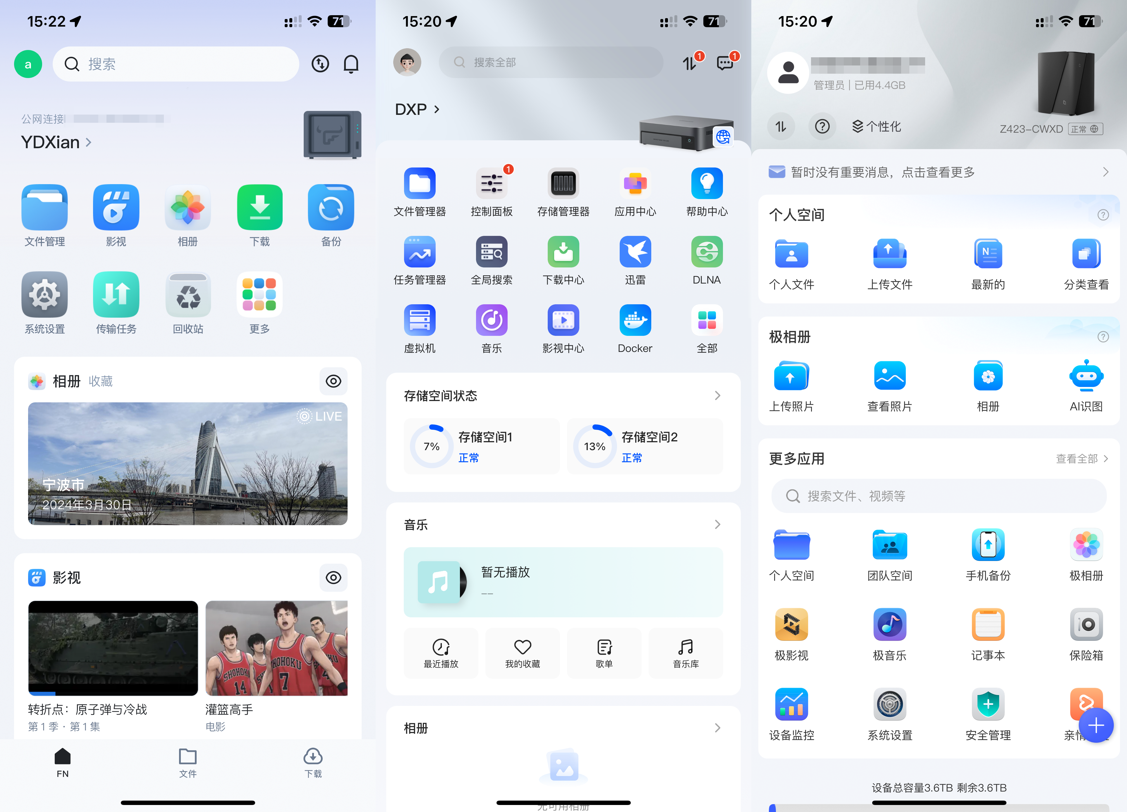 先放上一张轻NAS系统各家手机端APP对比,从左至右:飞牛,绿联,极空间。