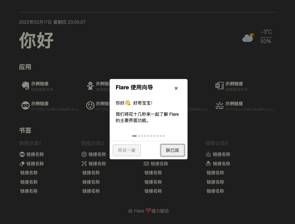Flare 最大的优势是在拥有和 Flame 一样的美观界面的前提下,拥有着绝对的性能优势:不论是 10M 不到的容器镜像体积、还是平时运行起来30M 以内的内存消耗、亦或者 99% 情况下的页面秒开(成千上万条书签),并且不会触发笔记本等设备的风扇狂转。