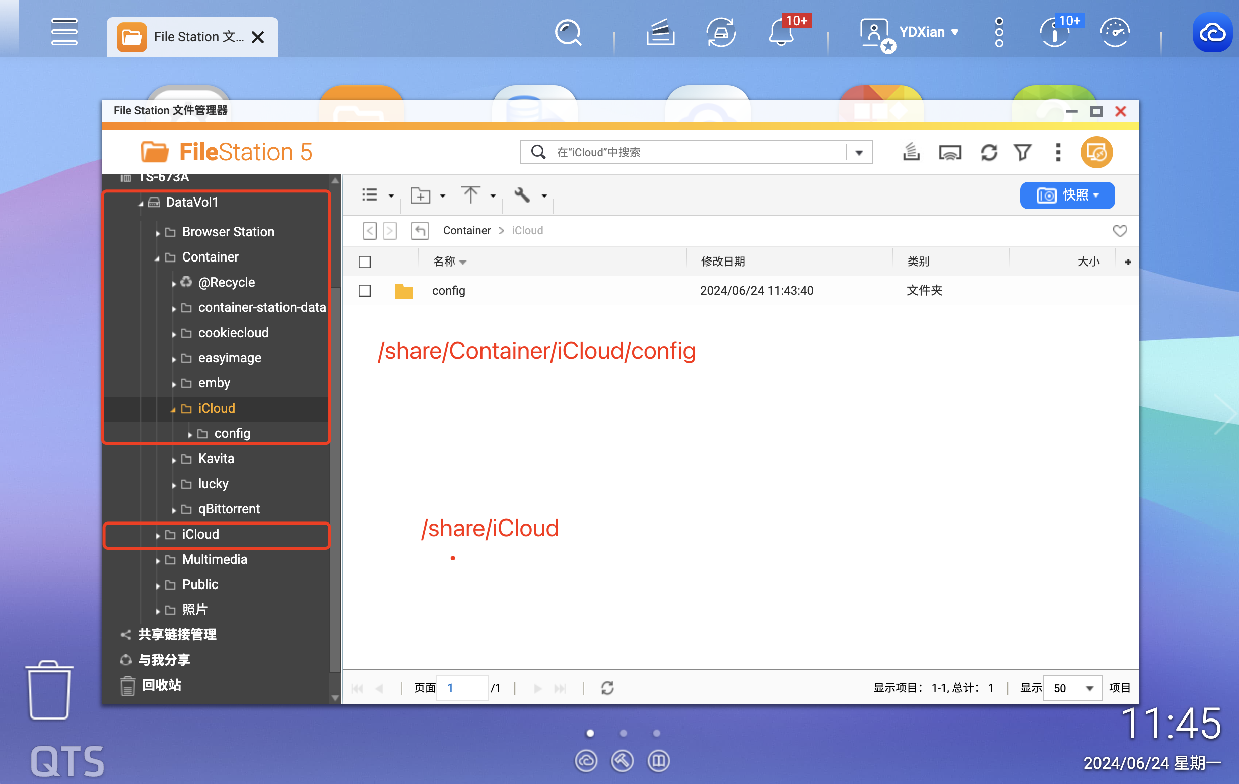 我这里的路径分别为/share/Container/iCloud/config和/share/iCloud,具体如下图所示: