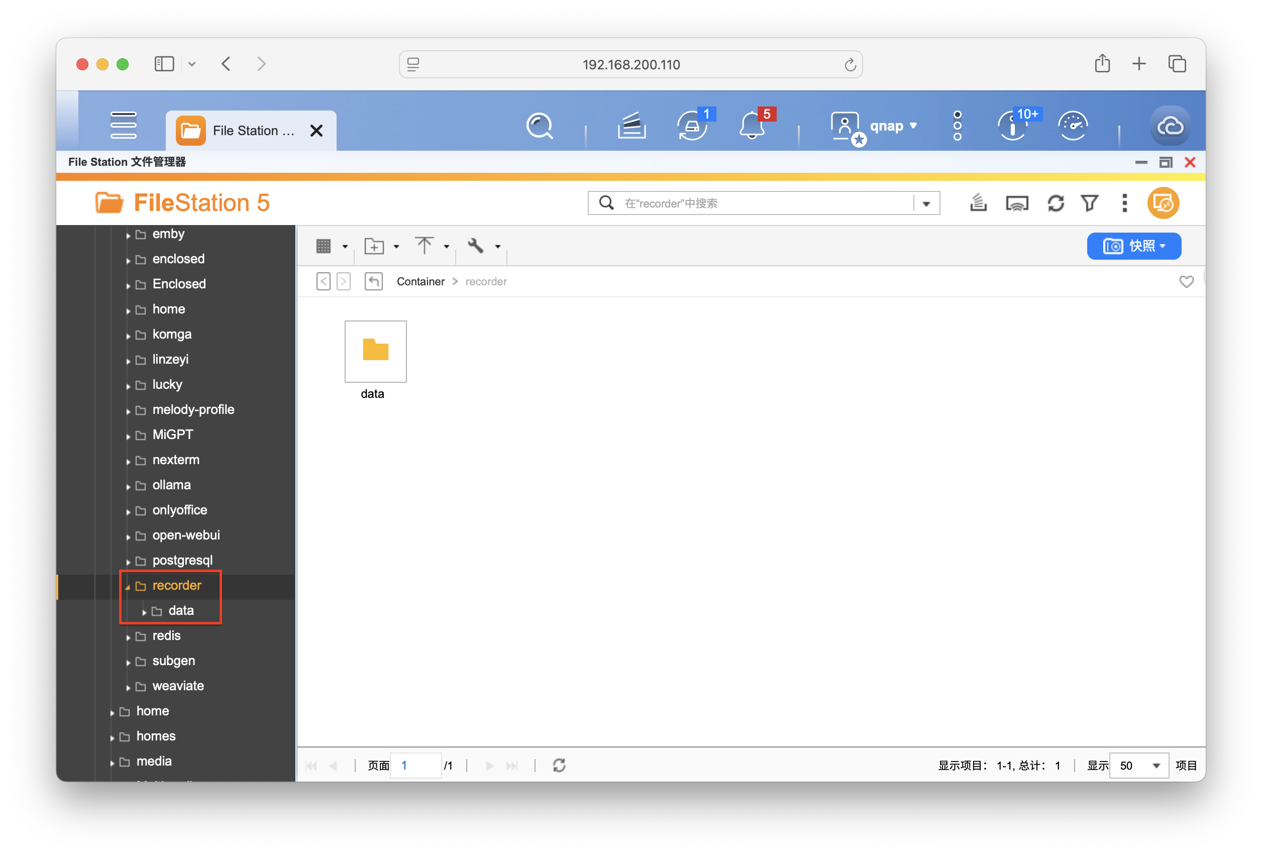 打开文件管理器,准备一个文件目录用于存放录播文件,命名为recorder。为了演示方便,我还是惯例放在Docker路径中:/share/Container/recorder/data,大家正式部署使用还是建议找个大容量的空间。