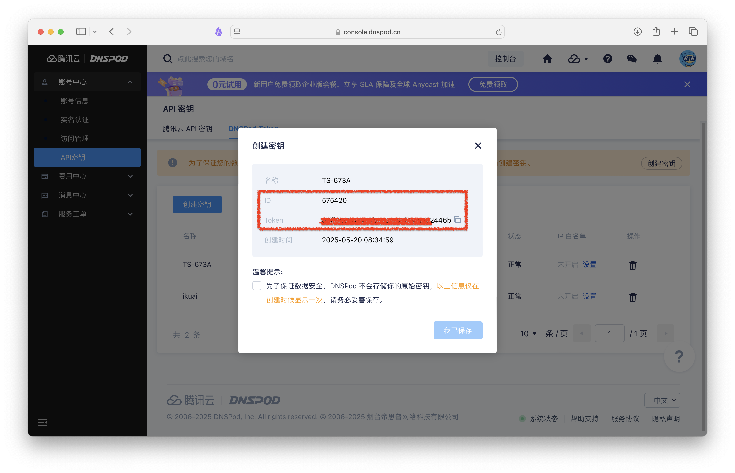 另外还需要我们提前准备Token,这个可从域名托管商处获得,我们以DNSPod为例。