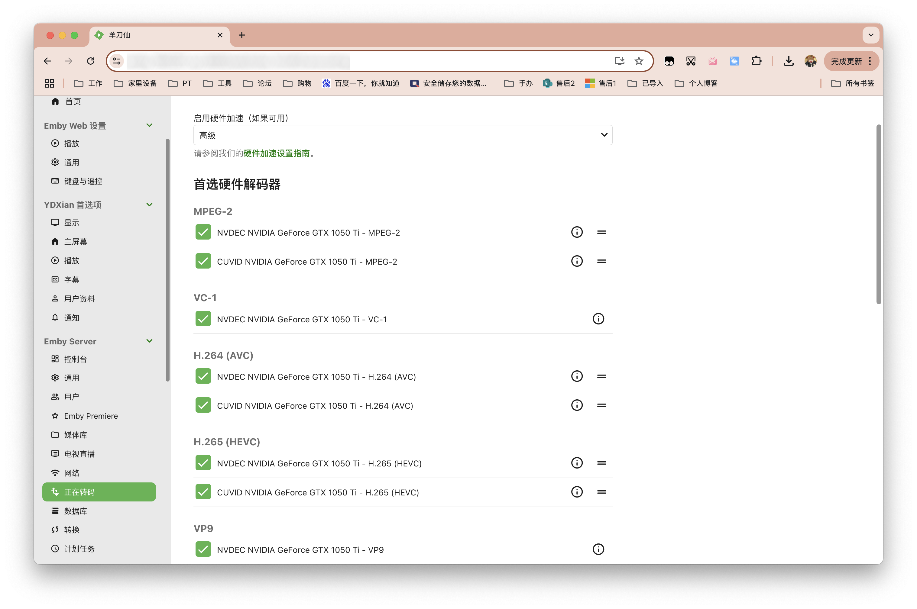 Emby部署完毕后,进入控制台,左侧栏点击「正在转码」,选择高级硬件加速后便可看到独显相关了。