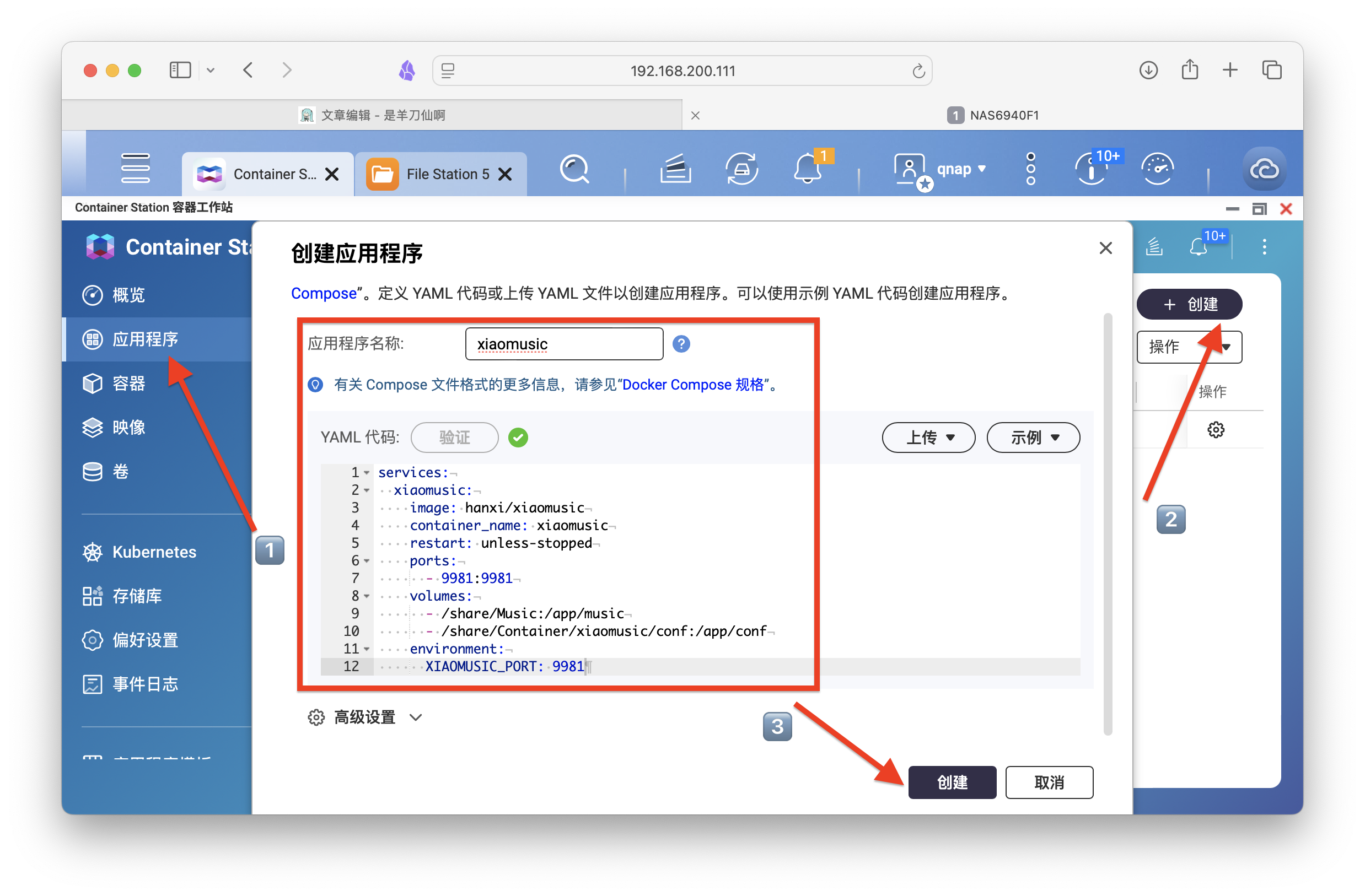 以威联通为例,打开Container Station,创建新的应用程序。将以下代码复制粘贴进框内,修改后进行创建。