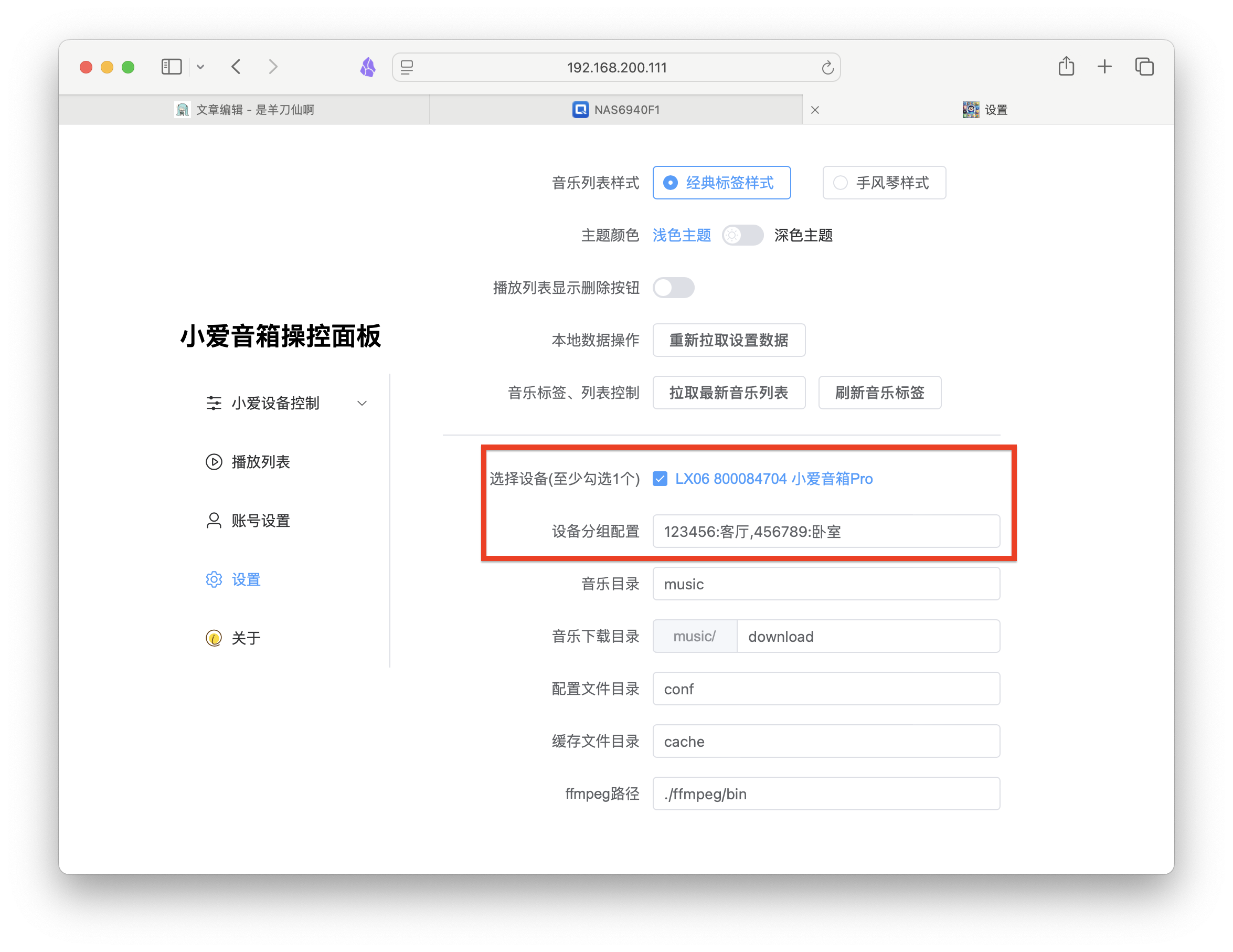 接着点击左侧设置,在上面登陆完成后,这里会出现你小米账户所绑定的所有可支持小米音箱。我家就这一个,选中后拉到底直接保存即可。